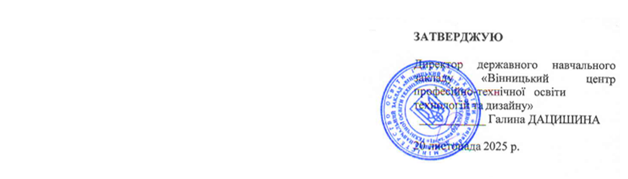 Затверджено наказом від 20.11.2025 № 297 «Про затвердження Правил прийому до державного навчального закладу «Вінницький центр професійно-технічної освіти технологій та дизайну» на 2026 рік»