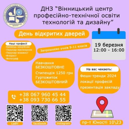 ЗАПРОШУЄМО НА НАВЧАННЯ ДО ВІННИЦЬКОГО ЦЕНТРУ ПРОФЕСІЙНО-ТЕХНІЧНОЇ ОСВІТИ ТЕХНОЛОГІЙ ТА ДИЗАЙНУ!
