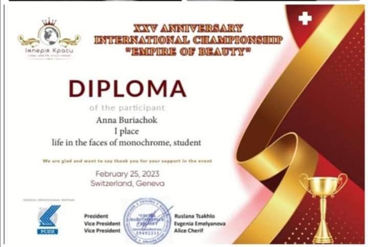 Талановита учениця ДНЗ"Вінницький центр ПТО технологій та дизайну" Бурячок Анна (підготувала майстер в/н Радзієвська Л. О.) прийняла участь у фаховому онлайн конкурсі "ХХV Міжнародному чемпіонаті "Імперія краси" в Швейцарії м. Женева в номінації" Життя в обличчях в кольорі (1типс).