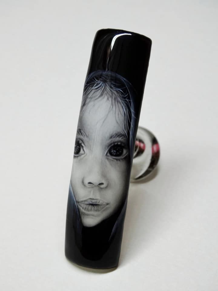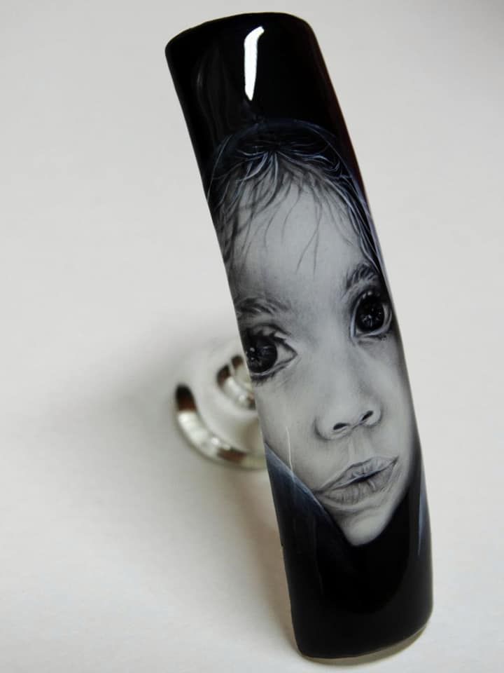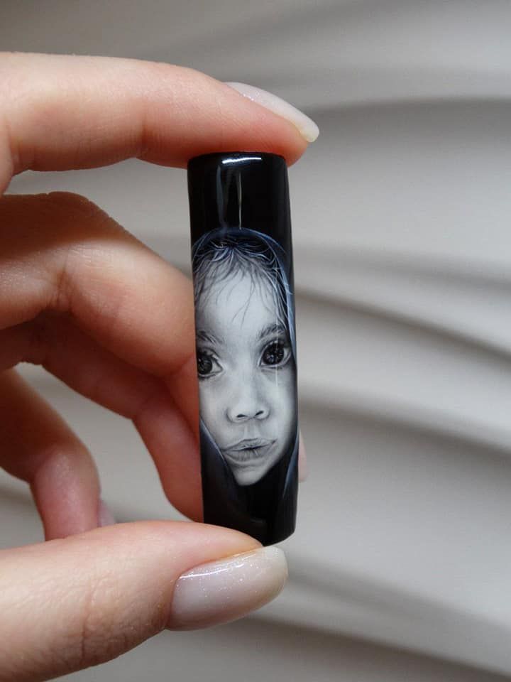 Потрібно було виконати на 1-му типсі розміром 5 см зображення обличчя людини. Анна намалювала фото маленької дівчинки, яка своїм зовнішнім виглядом демонструє біль та страждання наших дітей, які зараз переживають війну.