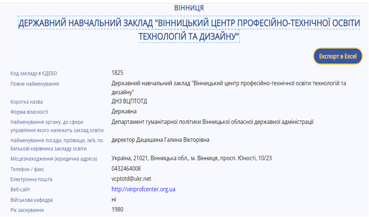 Адреса навчального закладу: 21021 м. Вінниця, проспект Юності, буд 10/23